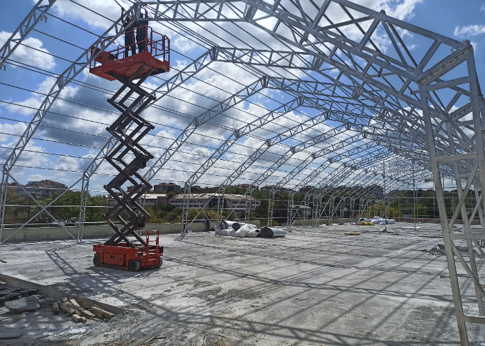 Görseldeki 20 metre makas açıklığına sahip çelik konstrüksiyon çadır iskeleti, zorlu saha şartları için özel olarak projelendirilmiştir. Basit tentelerden farklı olarak; endüstriyel hangar standartlarında statik mukavemete sahiptir. Depo, lojistik merkezi veya atölye olarak kullanabileceğiniz bu yapılar; alev yürümez branda ve yoğun kar yüküne dayanıklı profillerle donatılmıştır. İşinizi ve yatırımınızı güvenceye alan, mühendislik onaylı yapı sistemleri